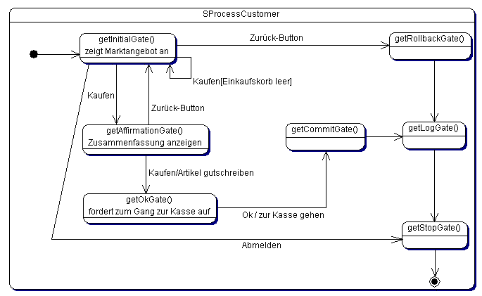 Nach der Anmeldung bei der Anwendung stellt ein initial gate die Anzeige seines PDA's dar, die sich aus dem aktuellen Angebot des Marktes mit einer kurzen Beschreibung eines jeden Artikels und dem Inhalt seines Einkaufskorbes zusammensetzt. Mal abgesehen davon, dass er sich jederzeit beim System abmelden kann, was einen Übergang (Transition) zum stop gate von SalesPoint und die Beendigung des Prozesses zur Folge hat, wird er jetzt sicherlich seinen Einkaufskorb reichlich füllen.