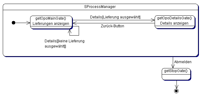 Besagte Lieferungen werden dauerhaft gespeichert und können in einem anderen Teil des Manager-Prozesses abgerufen werden. Eine Übersicht über die im Moment erwarteten Lieferungen bekommt man im opo main gate. Nach der Auswahl eines der Einträge aus dieser Liste kann sich der Manager dann auch noch die Details im opo details gate anschauen von wo aus er durch Betätigung des Zurück-Buttons wieder in die Übersicht zurück gelangt.